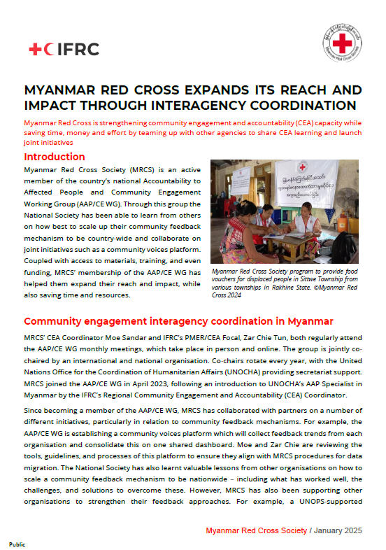 This case study explores how the Myanmar Red Cross Society has expanded its community feedback mechanisms and impact nationwide by actively participating in the national AAP/CE Working Group, gaining access to shared resources, training, and collaboration opportunities.