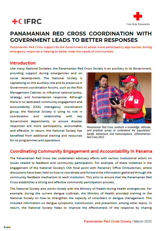This case study explores how the Panamanian Red Cross Society is using its auxiliary role and participation in Government coordination forums to influence national policy and promote more accountable disaster responses, while gaining access to additional training and resources.